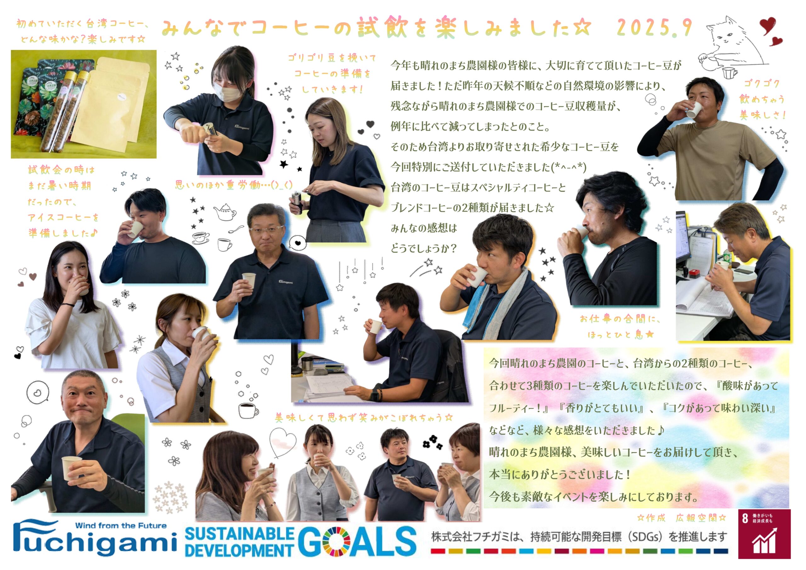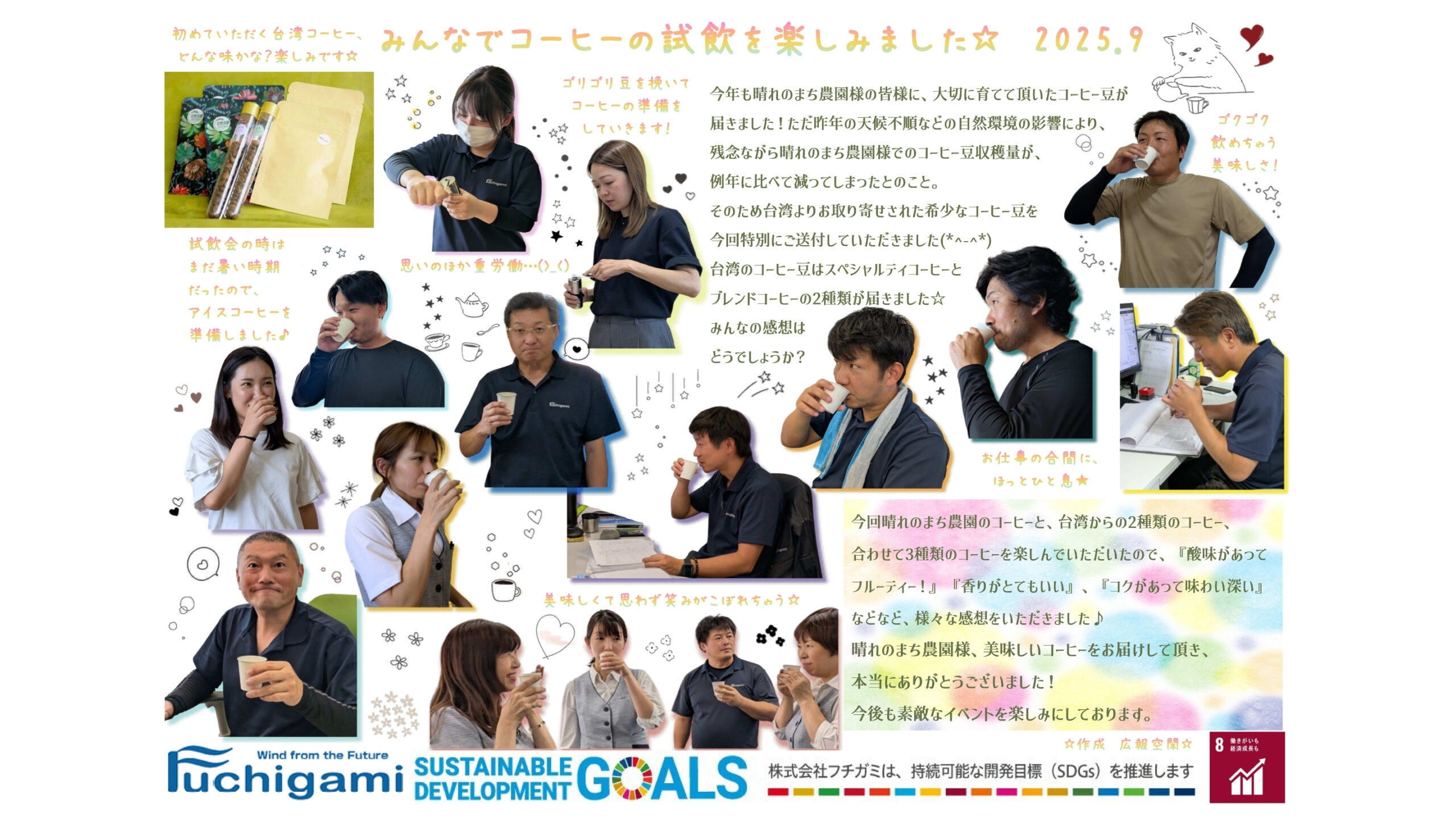 レクリエーション コーヒーの木 コーヒーの木のオーナーになりました ~試飲会~ 2025.10.06 晴れのまち農園様から、農園で大切に育てていただいたコーヒー豆が届きました。 ただ昨年の様々な天候不順により、残念ながら収穫量が減ってしまったとのことで、 今回希少な台湾のコーヒ豆も一緒に届けていただきました! 社内での試飲会の様子をお届けいたします。 当社は、晴れのまち農園様のコーヒー木のオーナー制度に申込み、 コーヒーの木の簡単なお世話を行ったり、晴れのまち農園様の企画するイベントに参加するなど、 社員やそのご家族が自然と触れ合えるレクリエーションの場として提供しています。