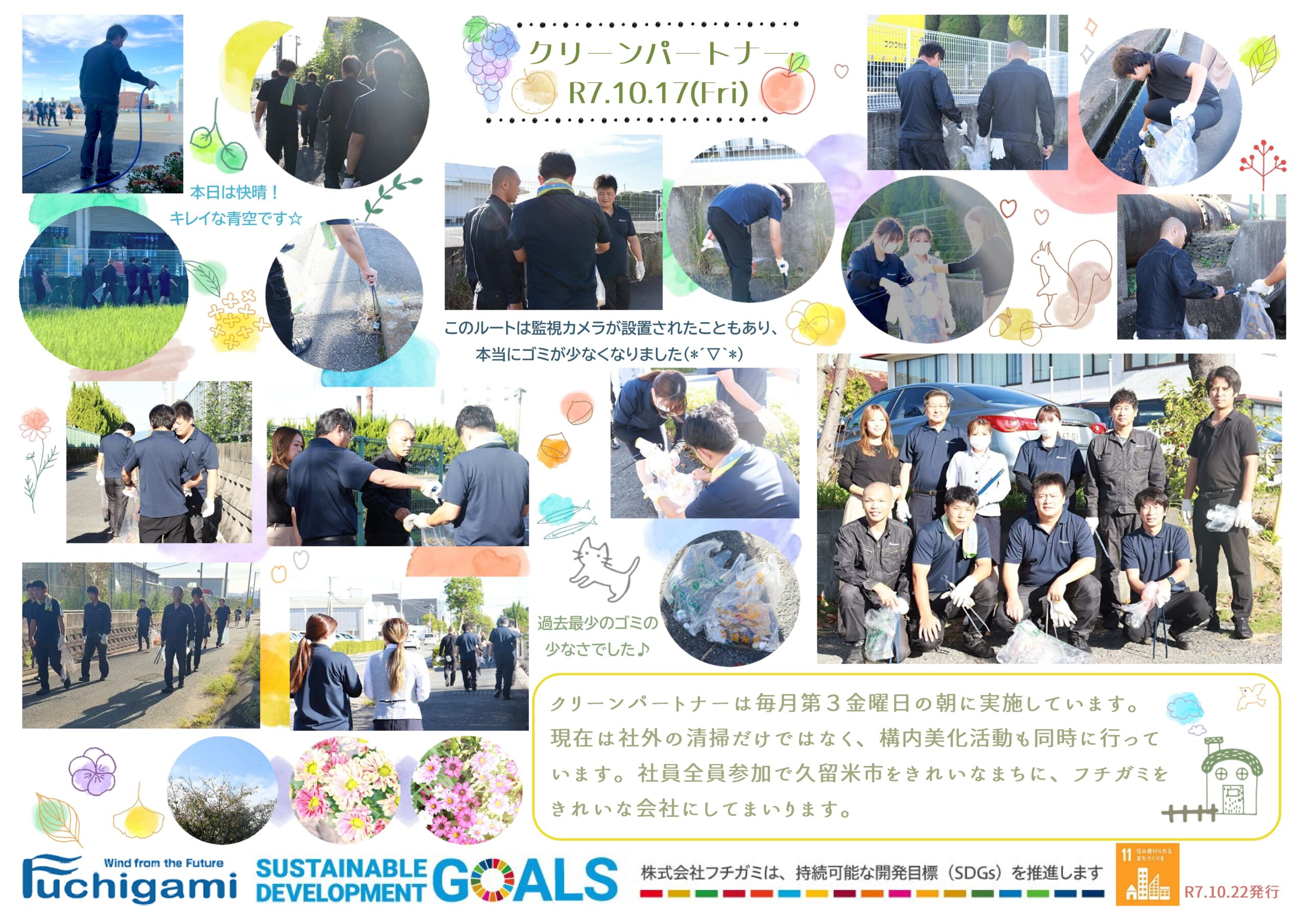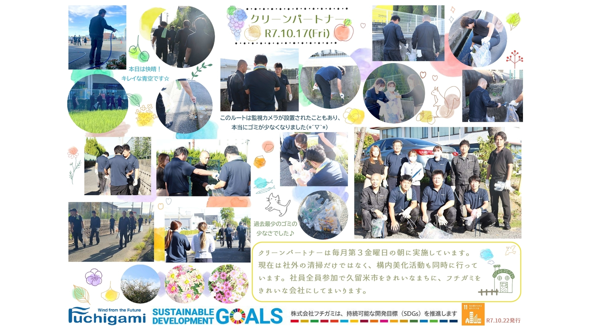 CSR くるめクリーンパートナー地域の清掃活動 本社周辺の清掃活動を行いました。 2025.10.23 10/17(金)に、本社周辺の清掃活動を行いました。 当社は久留米クリーンパートナー活動の一環として、毎月の第三または第四金曜日に 会社周辺及び構内の美化活動を行っております。