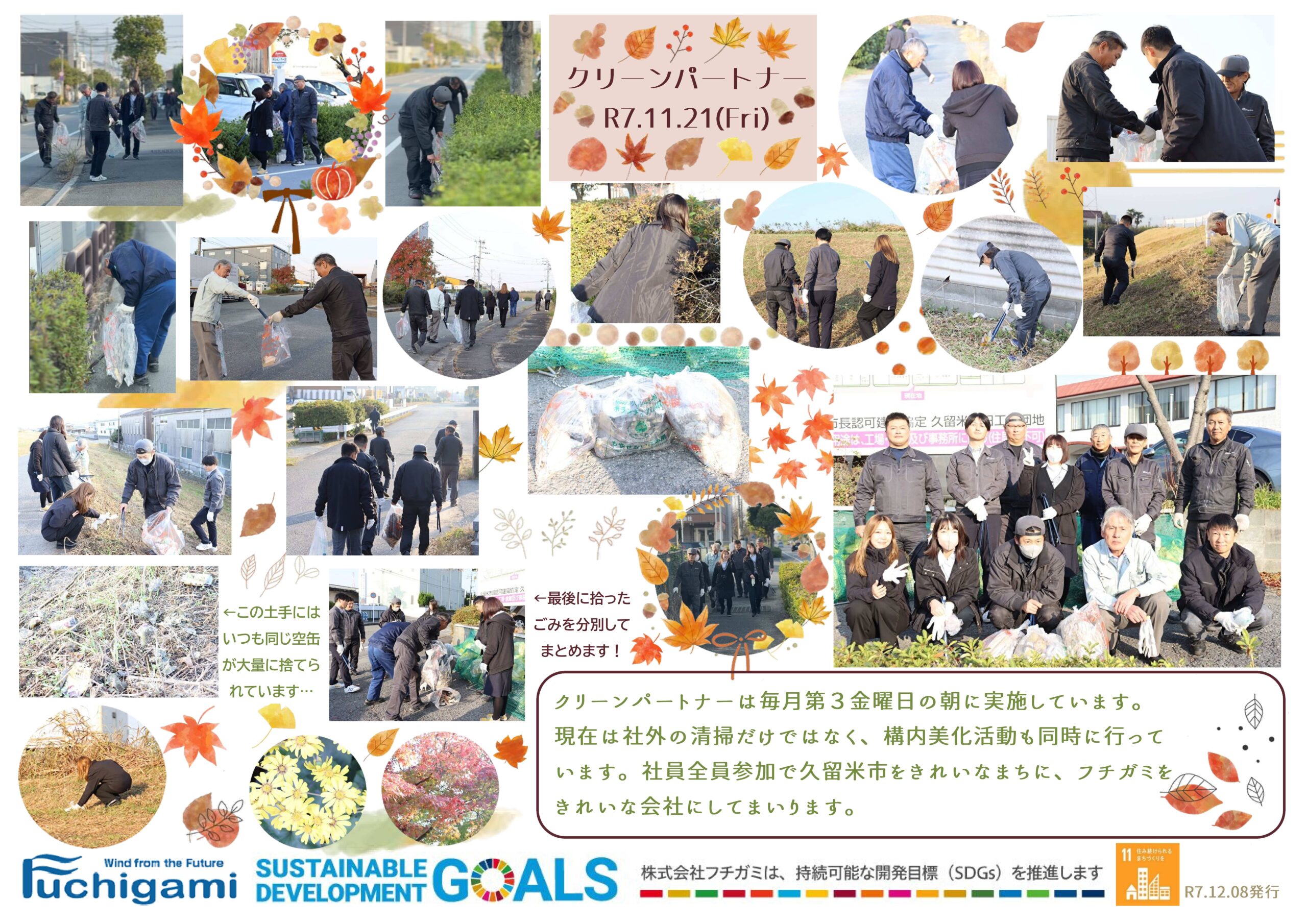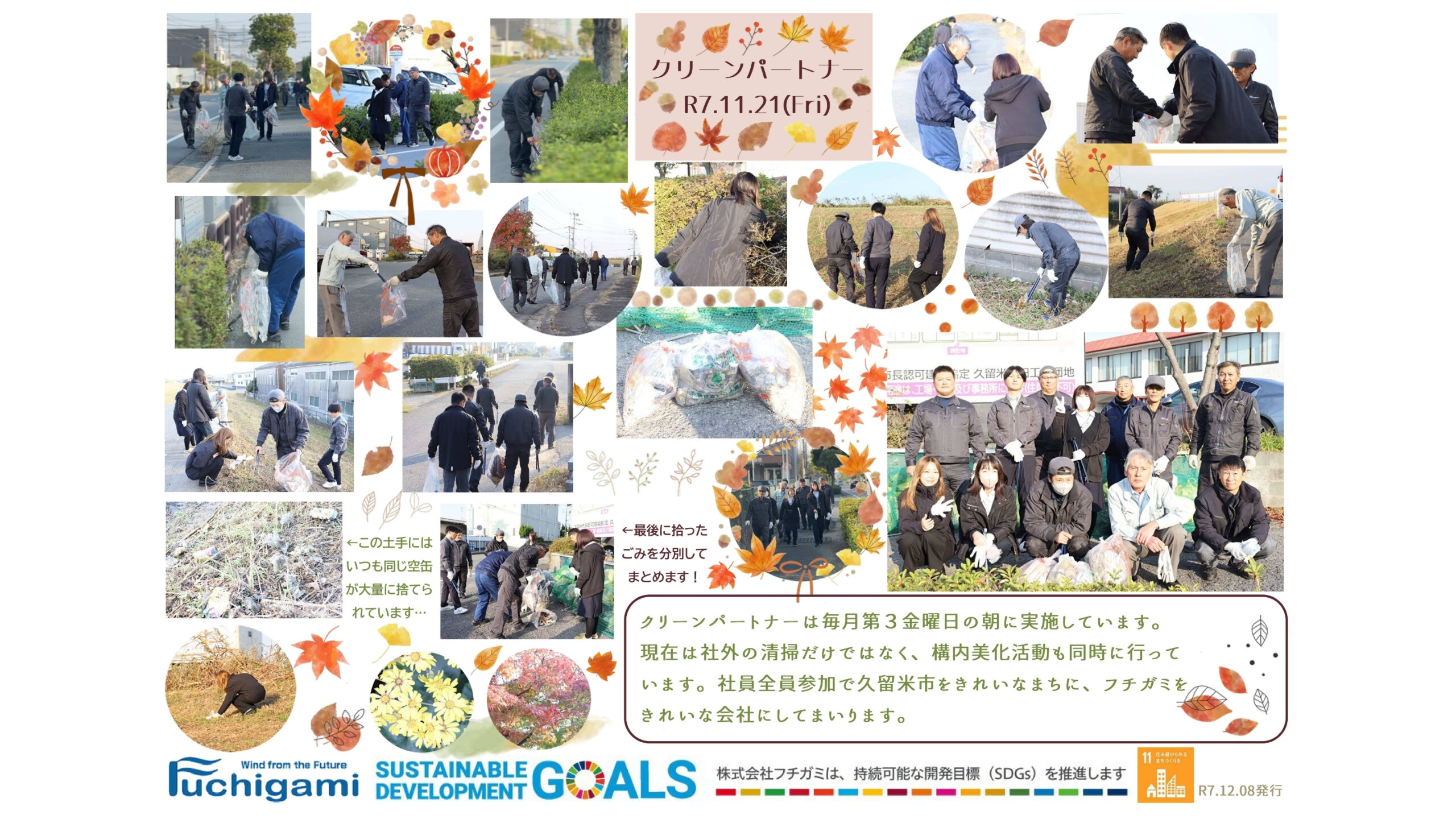 CSR くるめクリーンパートナー地域の清掃活動 本社周辺の清掃活動を行いました。 2025.12.10 11/21(金)に、本社周辺の清掃活動を行いました。 当社は久留米クリーンパートナー活動の一環として、毎月の第三または第四金曜日に 会社周辺及び構内の美化活動を行っております。