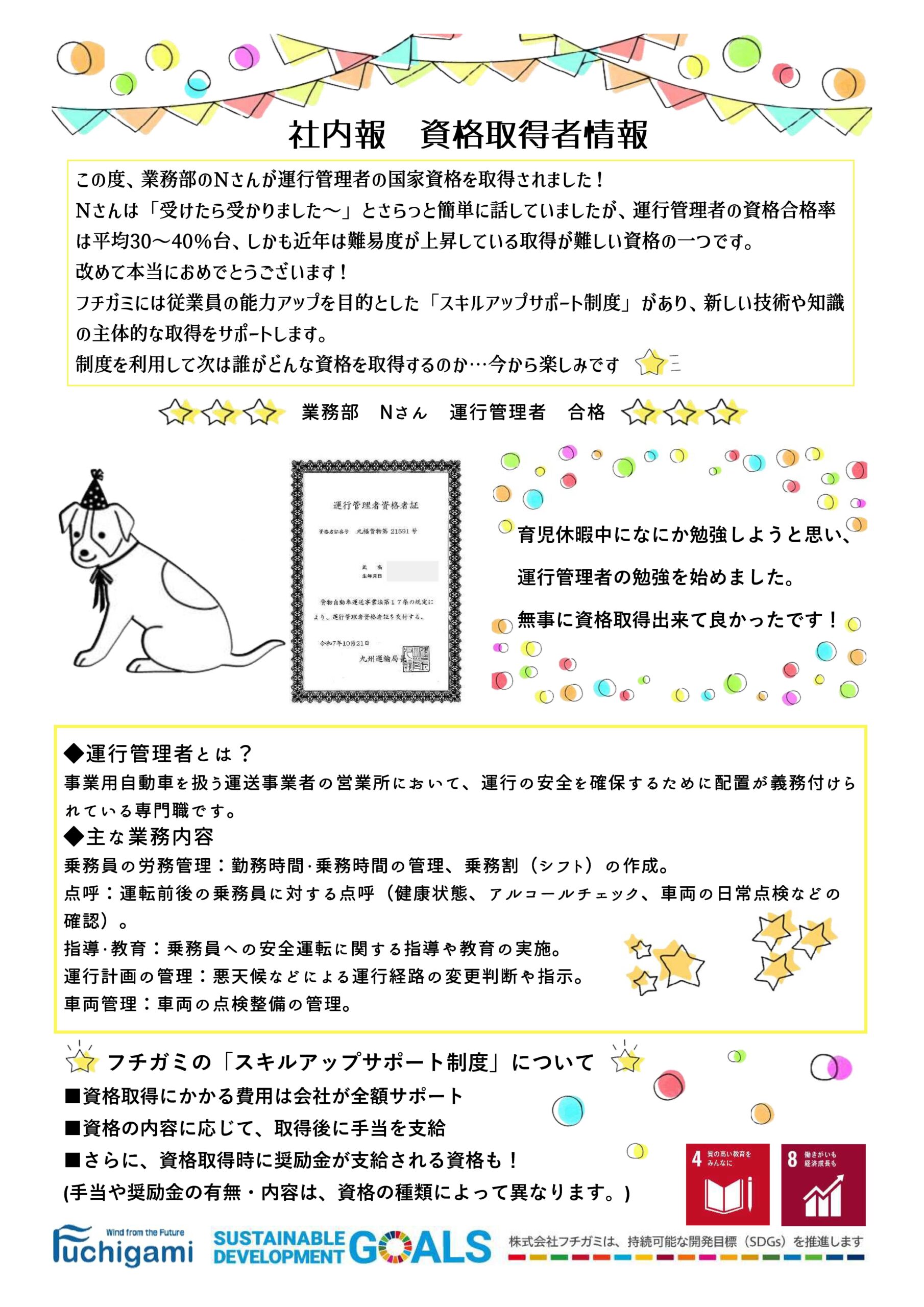 生涯学習 フチガミ社内報のご紹介 -令和7年12月 資格取得者情報- 2025.12.12 新たに業務に関連する資格を取得した社員についての社内報をご紹介させていただきます。 当社では社員向けにスキルアップサポート制度を導入し、新しい技術や知識の習得、 各種資格取得を推進しております。 ※社員のプライバシー保護の為、個人名はイニシャルに差し替えております。