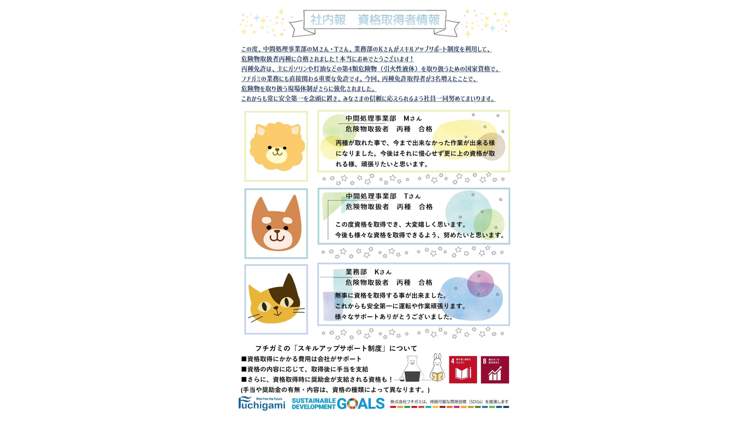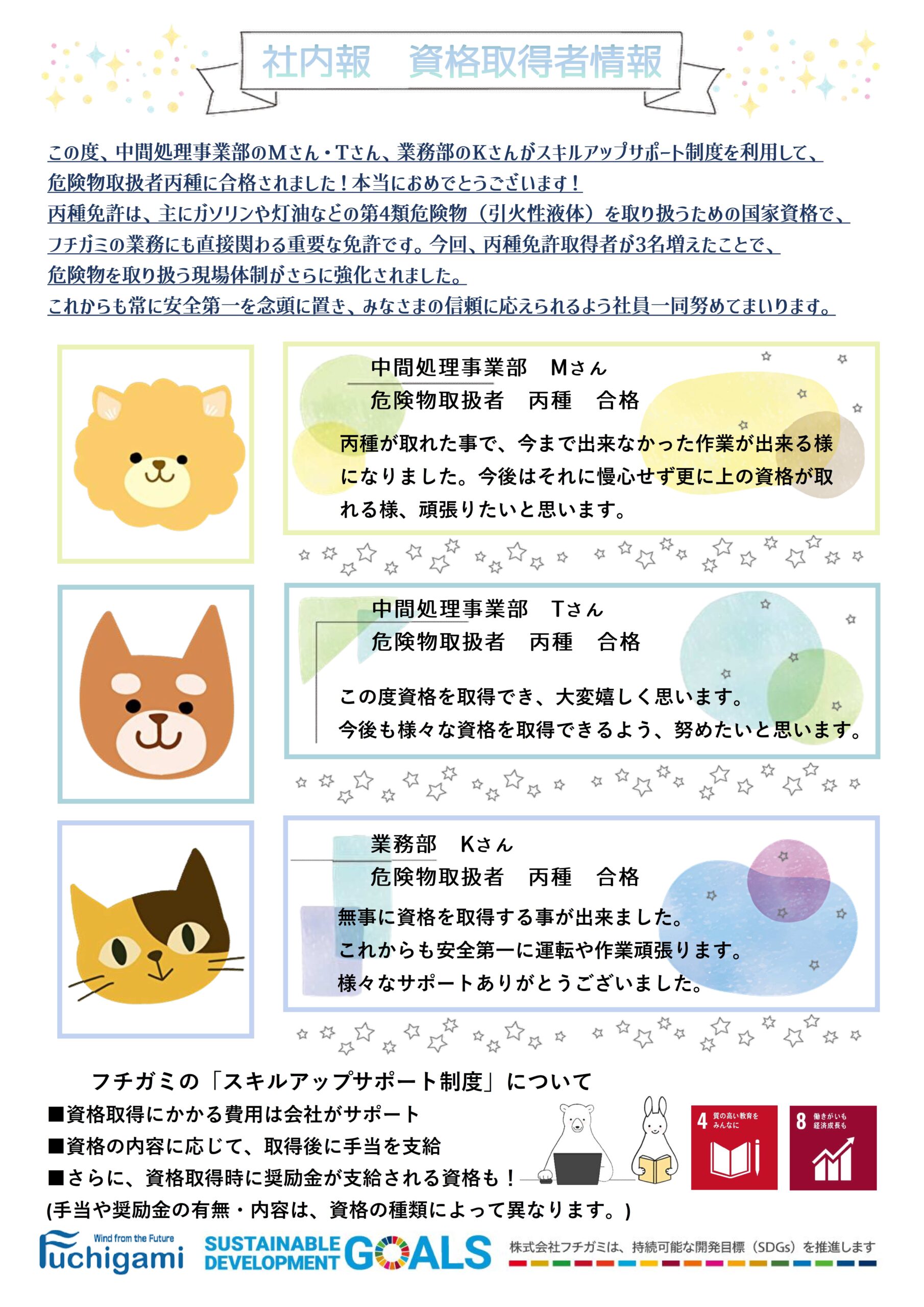 生涯学習 フチガミ社内報のご紹介 -令和8年2月 資格取得者情報- 2026.02.21 新たに業務に関連する資格を取得した社員についての社内報をご紹介させていただきます。 当社では社員向けにスキルアップサポート制度を導入し、新しい技術や知識の習得、 各種資格取得を推進しております。 ※社員のプライバシー保護の為、個人名はイニシャルに差し替えております。